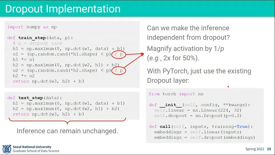 실제 pytorch 등에서는 dropout을 별도의 layer로 만들고 통과시켜주는 방식으로 사용하게 됨