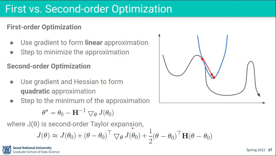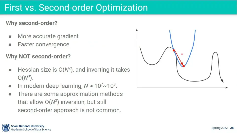 2차 최적화을 사용하면 더 정확하고 수렴을 빨리 할 수 있지만, 연산 속도가 느리다.