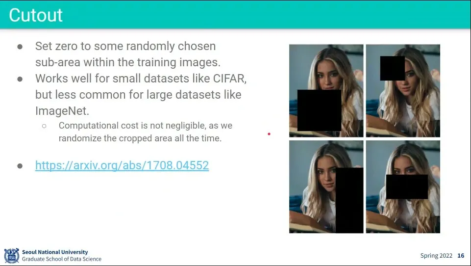 Cutout은 마치 Dropout처럼 데이터의 일부분을 제외하고 학습 시킴