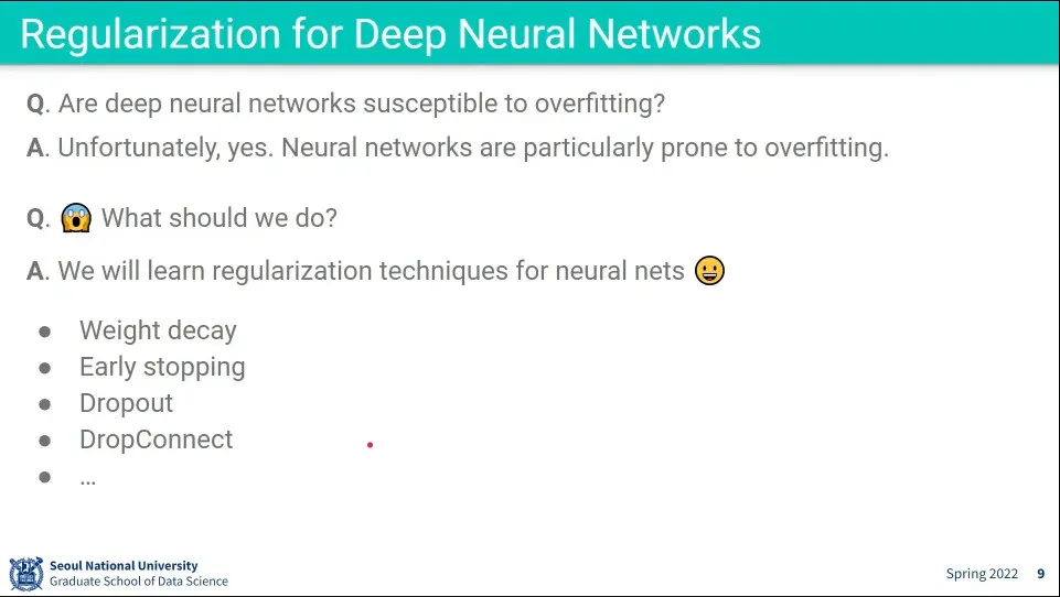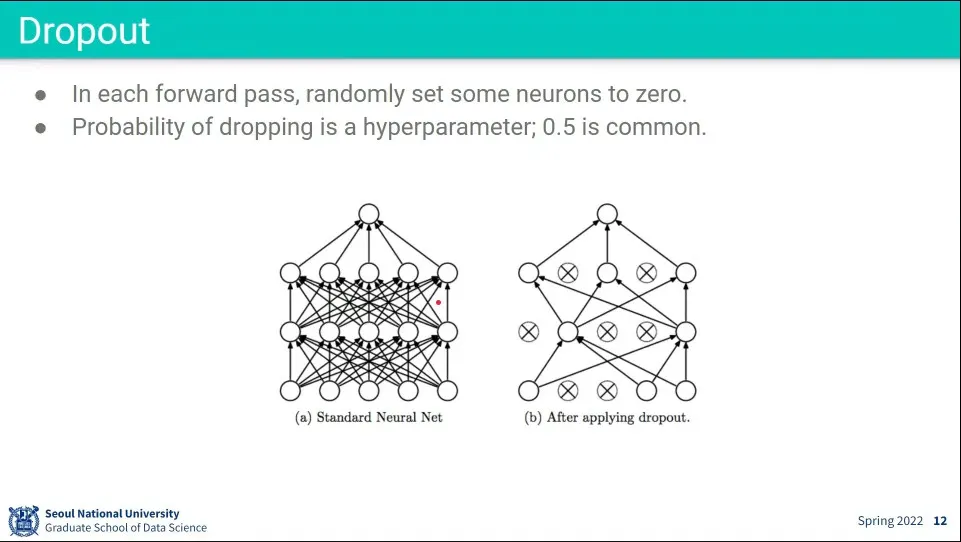 neural network는 표현력이 뛰어나다는 특성 덕분에 overfitting이 매우 잘 일어난다. 때문에 이것을 방지하기 위해 아래와 같은 다양한 regularization 방법을 사용할 수 있다.