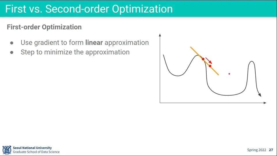 1차 최적화은 현재 위치에서 Gradient를 선형(1차 함수)으로 구해서 감소하는 방향으로 움직이게 하는 것