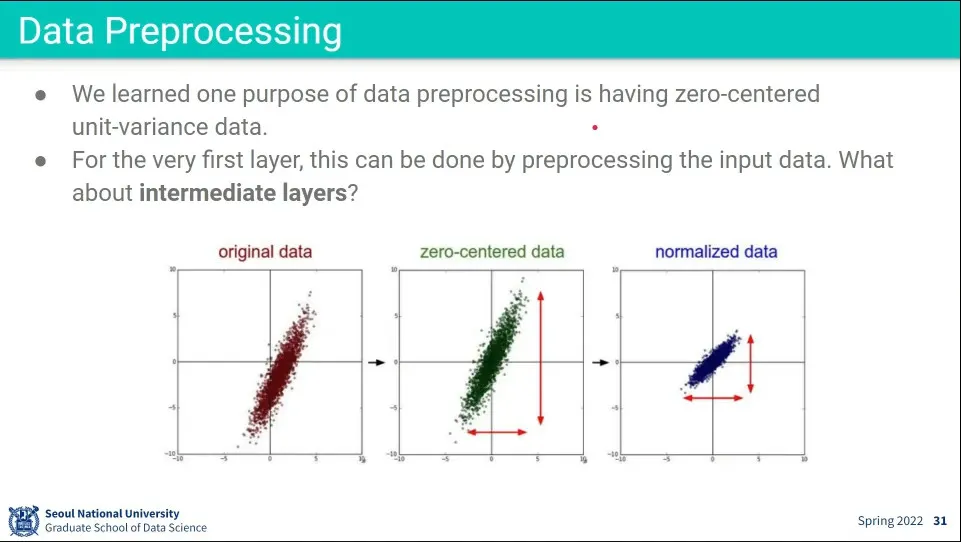 데이터 전처리 과정에서 zero-centered하고 normalized 시켜주는게 좋다.