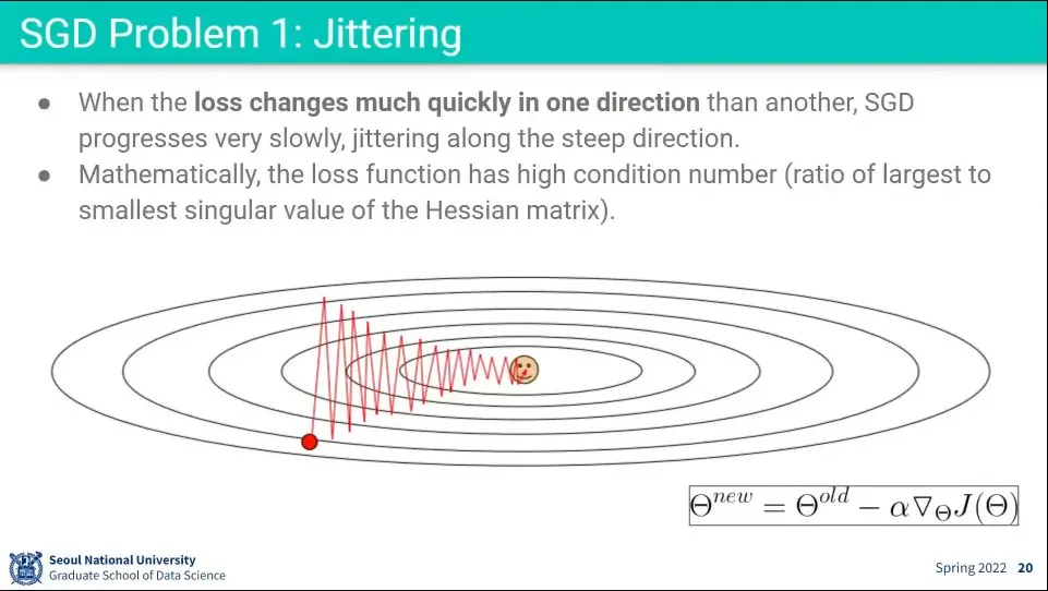 만일 한 방향은 가파르고 다른 한 방향은 완만하다면 가파른 방향으로는 빠르게 움직이고 완만한 방향으로는 천천히 움직이는 jittering이 발생함. (왔다갔다)