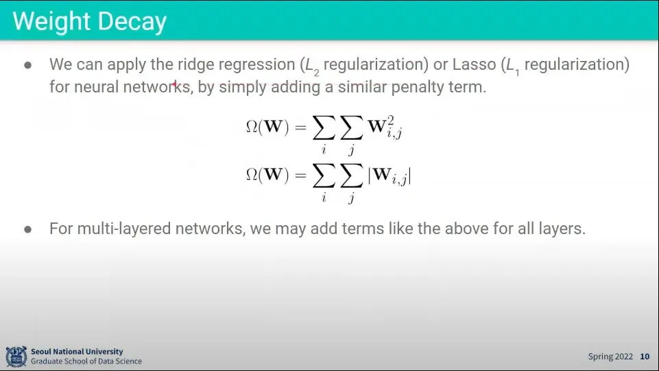 선형회귀에서 Regularization을 했던게 Weight Decay이다.