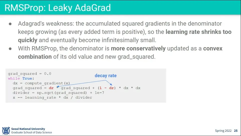 이것을 보완하기 위해 과거 데이터를 decay 시켜 주는게 Leaky AdaGrad. RMSprop이라고도 한다.