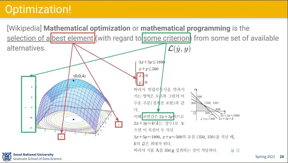 최적화는 주어진 조건을 최적화하는 x, y 조합을 찾는 문제와 같음