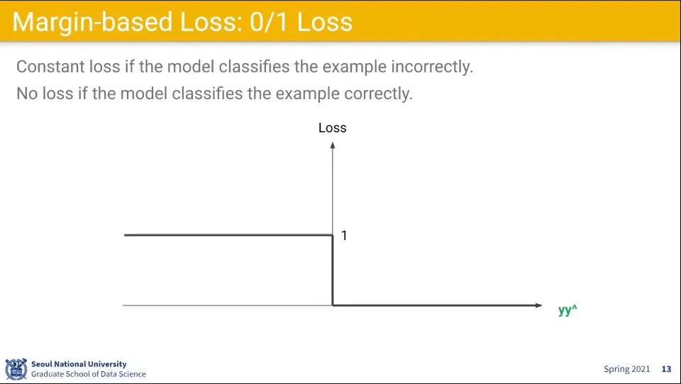 틀렸을 때는 1, 맞았을 때는 0이 나오는 이러한 함수를 0/1 Loss라고 한다.