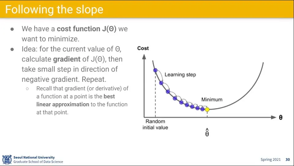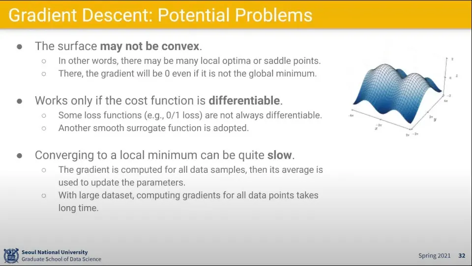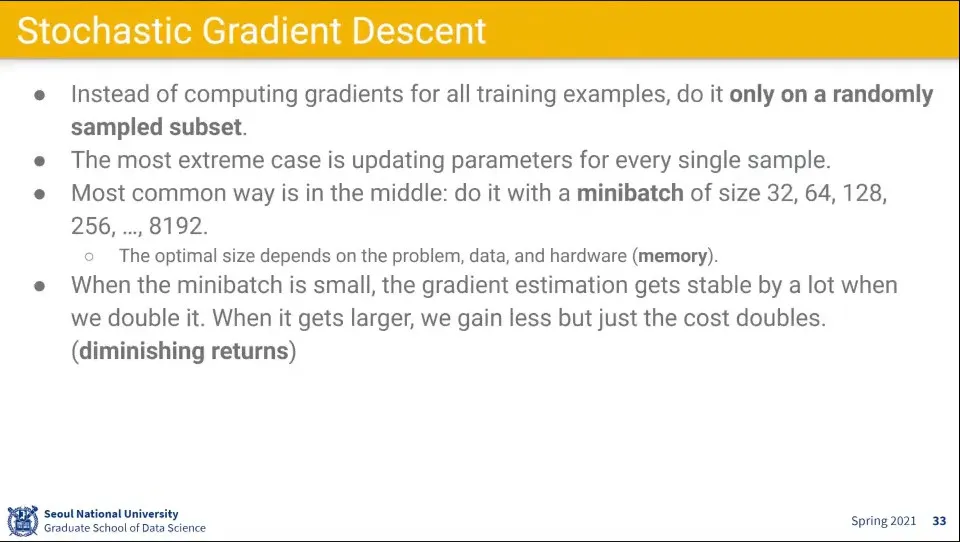 Gradient Descent의 계산이 오래 걸리는 부분을 개선한 것이 Stochastic Gradient Descent(SGD)이다.