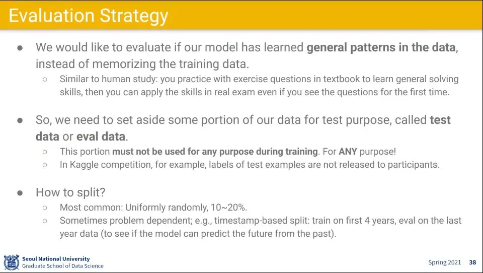 test data는 오로지 테스트에서 사용해야 하고, 학습 과정에서는 절대 사용되어서는 안 된다. —학습할 때 매번 랜덤으로 데이터를 나누면 테스트 데이터가 학습 과정 중에 들어갈 수 있으므로 안 됨. 아예 별도로 데이터를 따로 빼 놔야 함