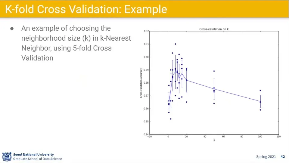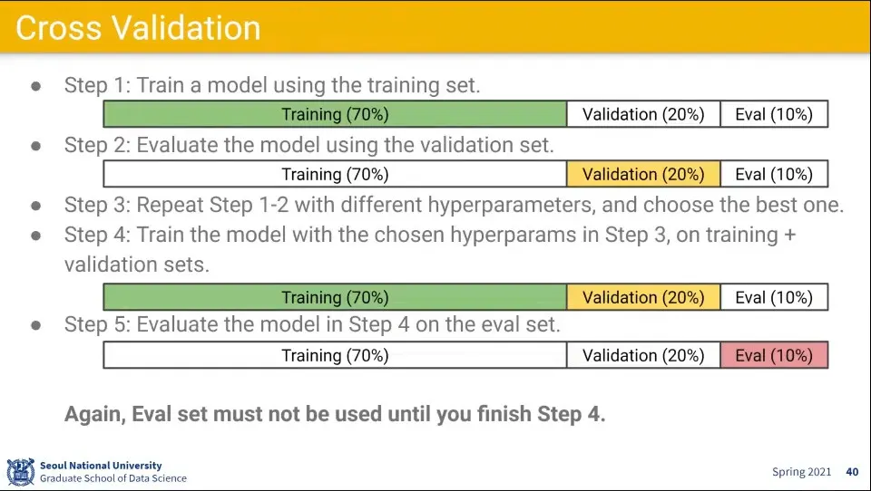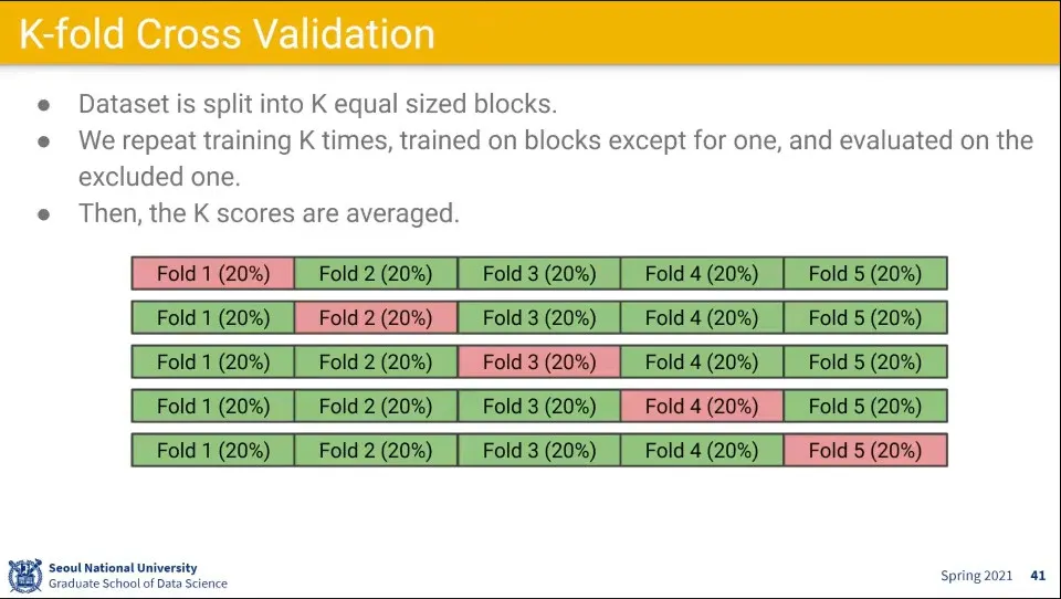 위 과정이 번거롭기 때문에 K-fold Cross Validation 방법을 사용할 수 있는데, 많이 쓰이지는 않음
