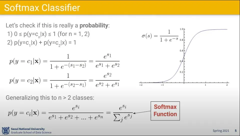 그런데 결과는 클래스별로 나타나므로, 위의 sigmoid 함수를 전체에 대해 확률로 표현할 수 있게 softmax 함수를 씌운다.