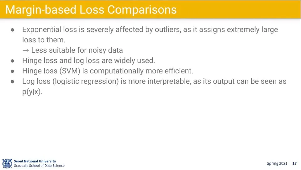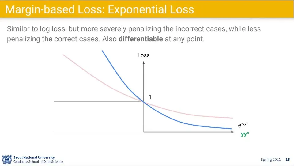 Exponential Loss는 값이 극단적이라 잘 안 사용하고 Log Loss와 Hinge Loss는 자주 사용한다.